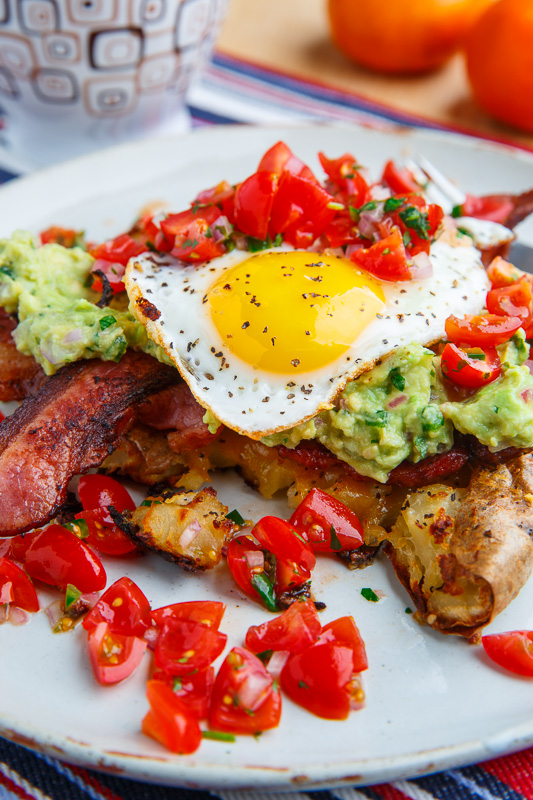 Crispy Smashed Potato Pancakes with Guacamole, Pico de Gallo, Bacon and Eggs