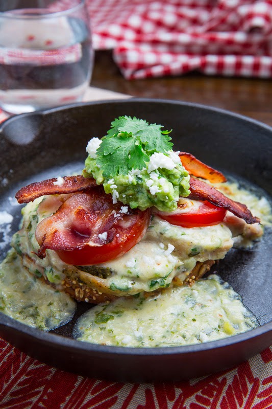 Buffalo Chicken Stuffed Zucchini topped with Melted Cheddar, Bacon and an Avocado Blue Cheese Dressing