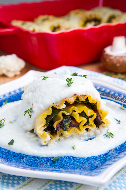 Mushroom and Kale Lasagna Roll Ups in Creamy Gorgonzola Cauliflower Sauce